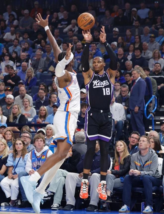此役, 威少首發(fā)出戰(zhàn)30分鐘,投籃16中6,三分8中4,得到16分9籃板4助攻1搶斷。